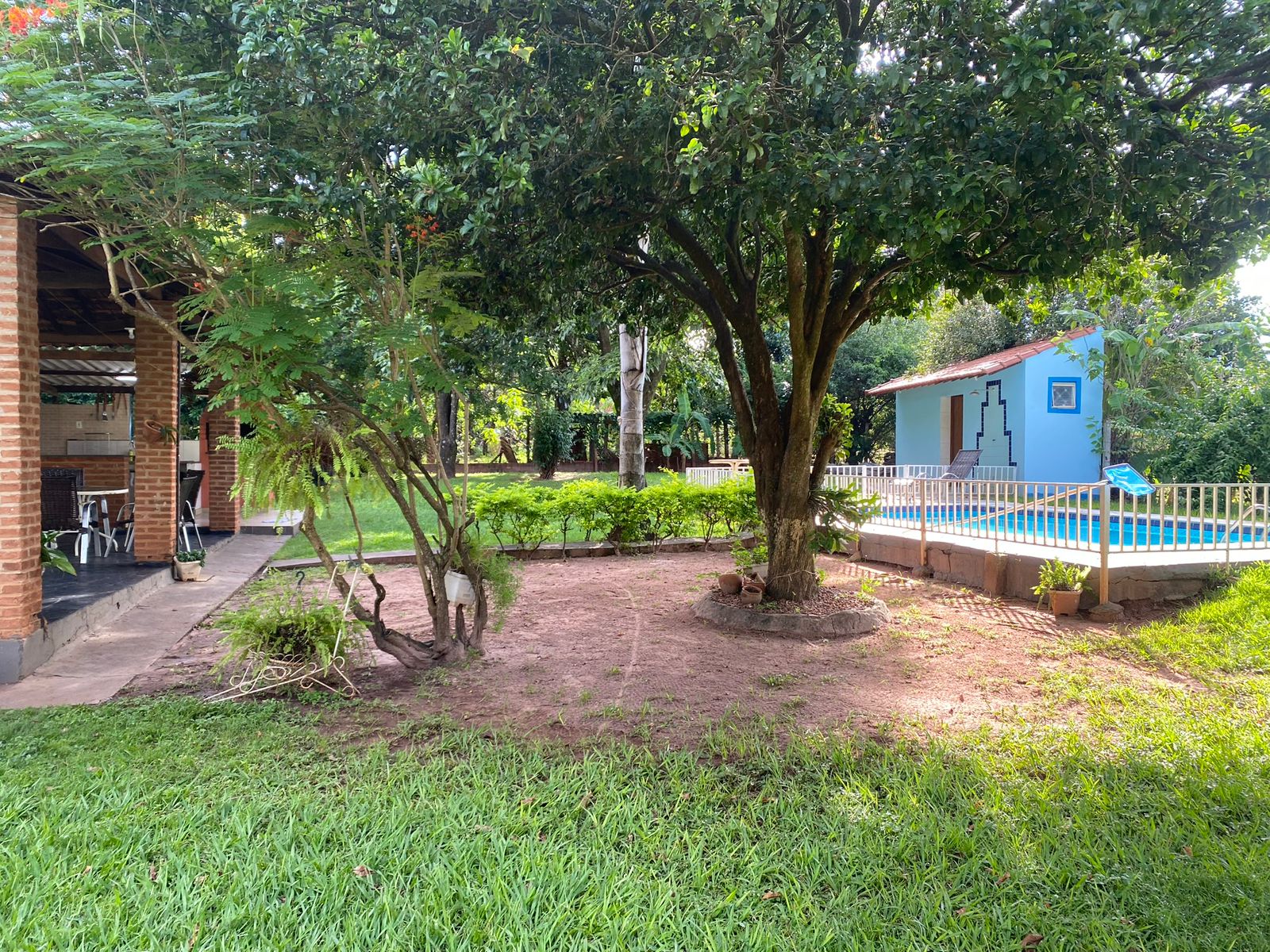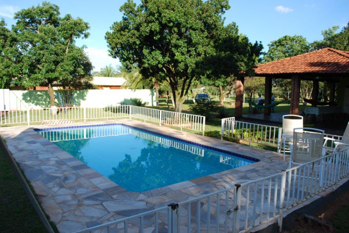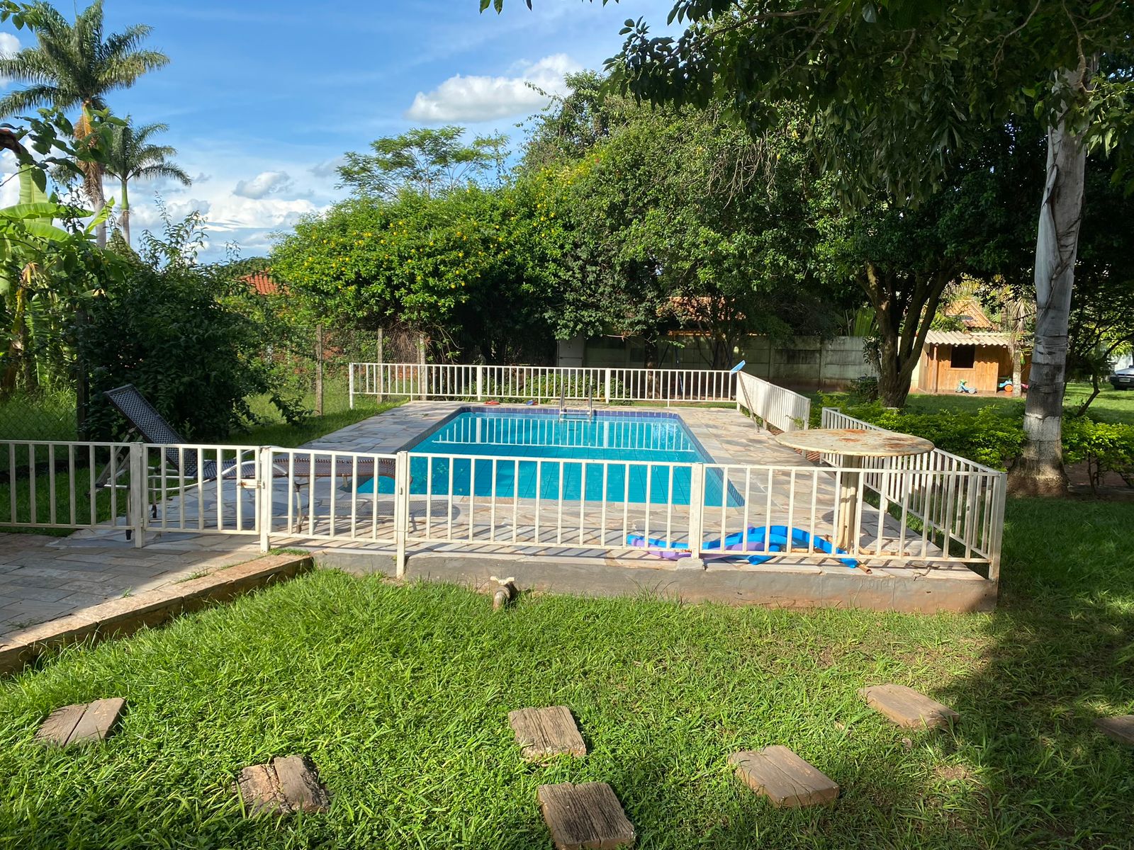 Piscina de biribol com deck de pedra, toda cercada com grade. Poço semi-artesiano.