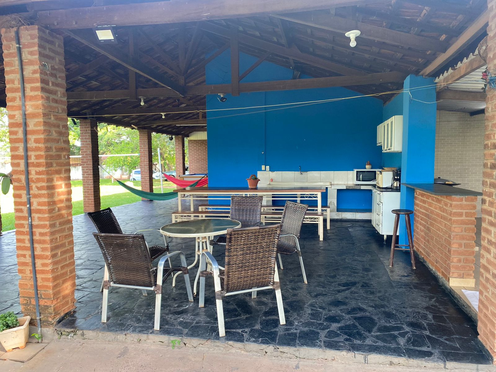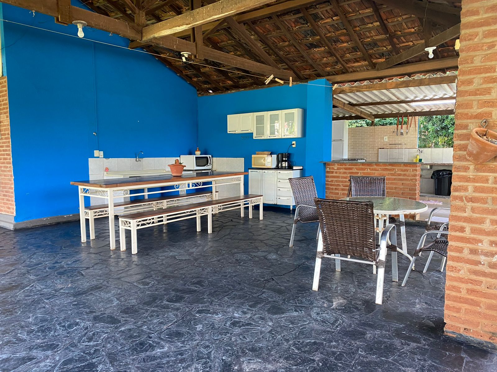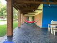 Varanda com espaço para festas até 40 pessoas com churrasqueira de alvenaria, balcão, cozinha e mesa de sinuca.
