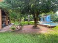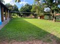 Amplo espaço verde com gramado, plantas ornamentais e árvores.
